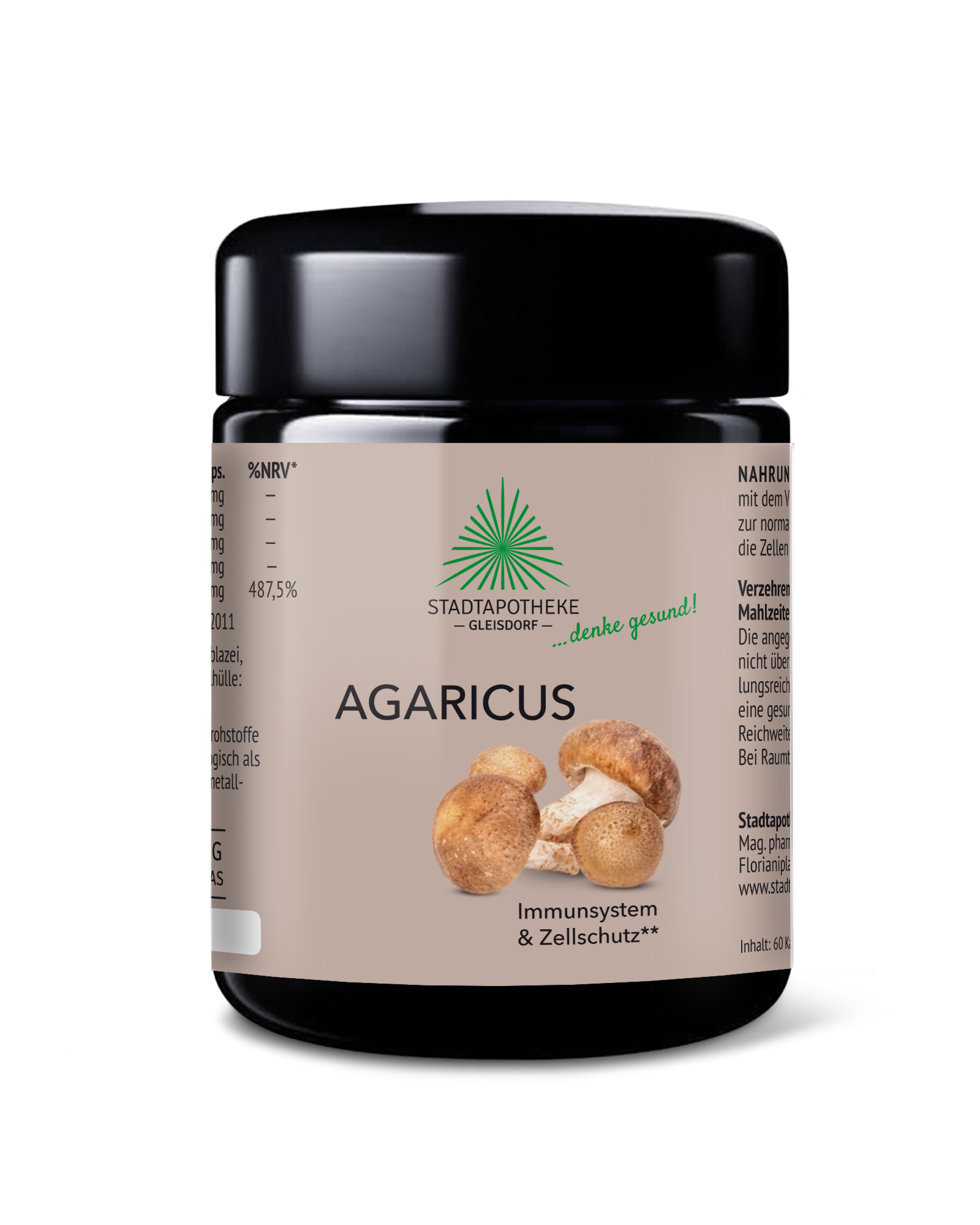 Agaricus, der Mandelpilz, ist ein proteinreicher Pilz mit einem hohen Gehalt an Polysacchariden und Beta-Glucanen. Der Extrakt ist auf 30 % Polysaccharide und 20 % Beta-Glucane standardisiert. Vitamin C mit verzögerter Freisetzung (Calciumascorbat) unterstützt die normale Funktion des Immunsystems und den Zellschutz.
